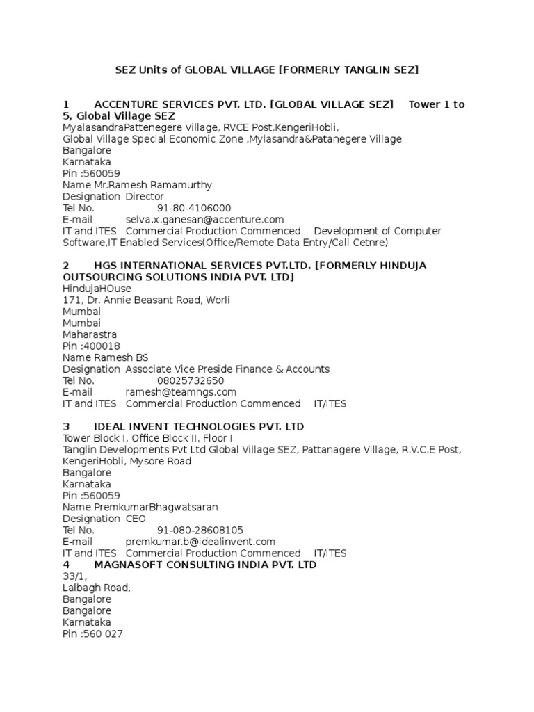 List Of Companies With Contact Details For Global Village Bangalore Outsourcing